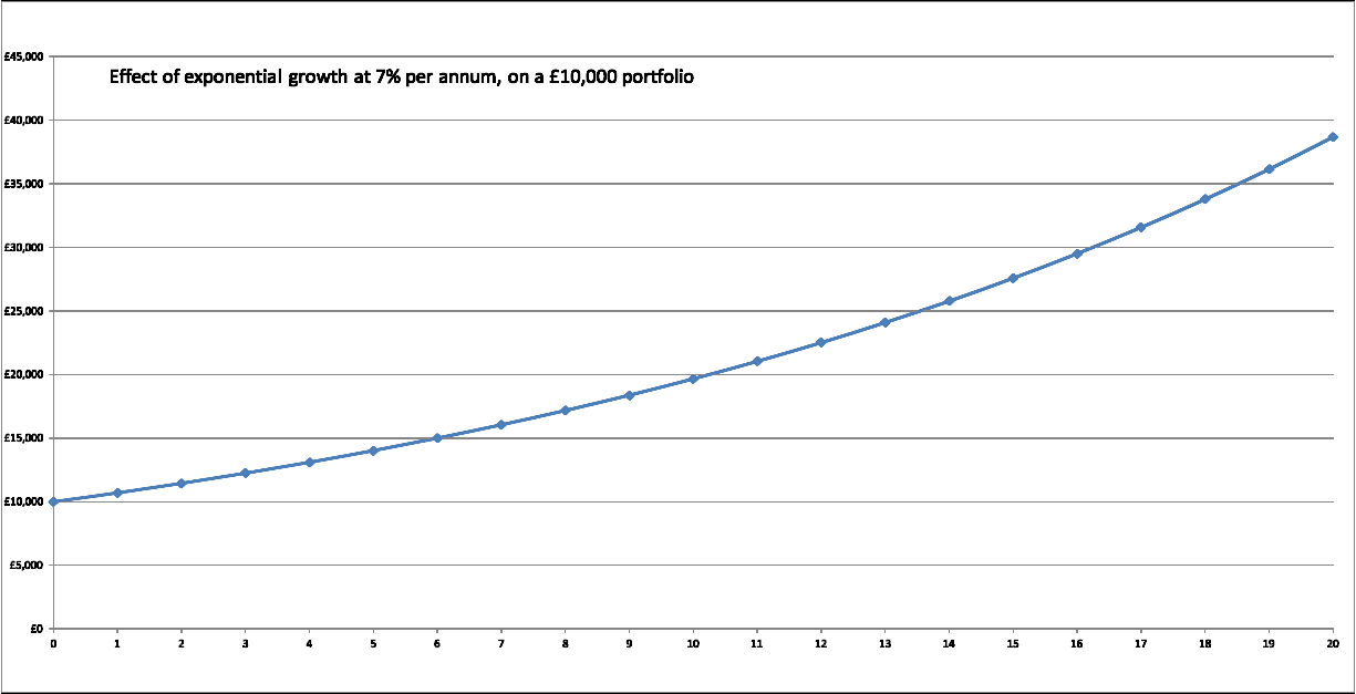 Historical evidence shows that the world’s stock markets, have generated a positive exponential growth over the last 150 years. Taking an estimate of this growth rate to be 7% per annum (in inflation-adjusted or real-terms, and assuming dividends re-invested), and ignoring for a moment volatility, the value of an average £10,000 portfolio would change as shown below…